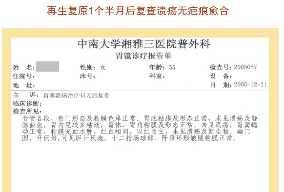 例2:盖某某,,,,,,女,,,,,,54岁,,,,,,2007年6月最先胃肠器官原位再生回复,,,,,,一年后整个胃肠系统大部分再生回复,,,,,,粘膜体征均体现为年轻状态。。。。。