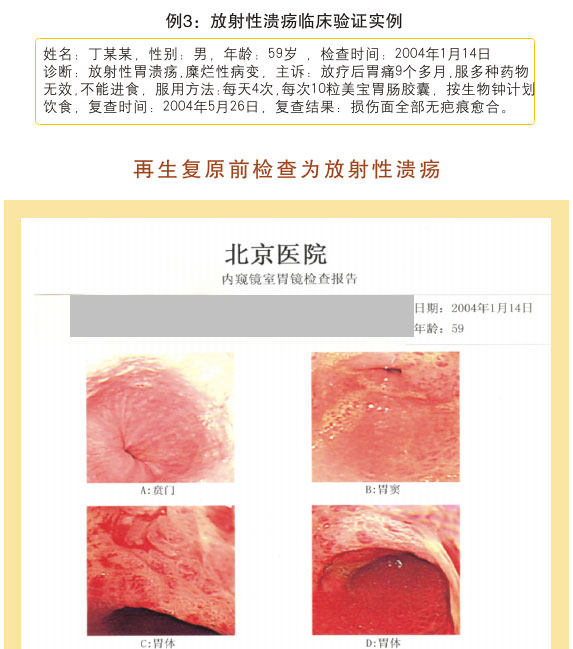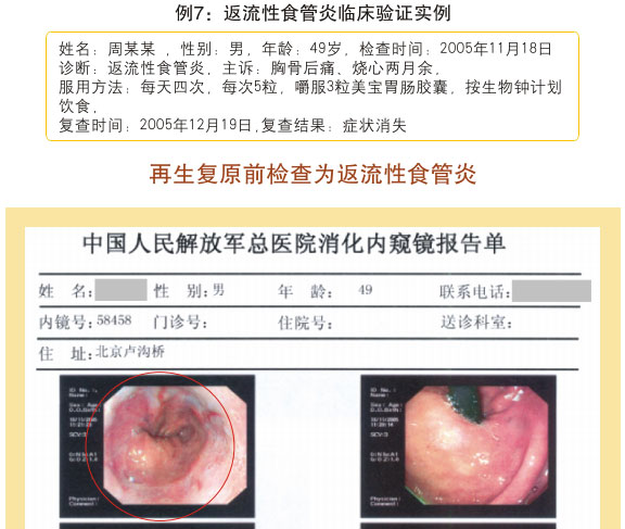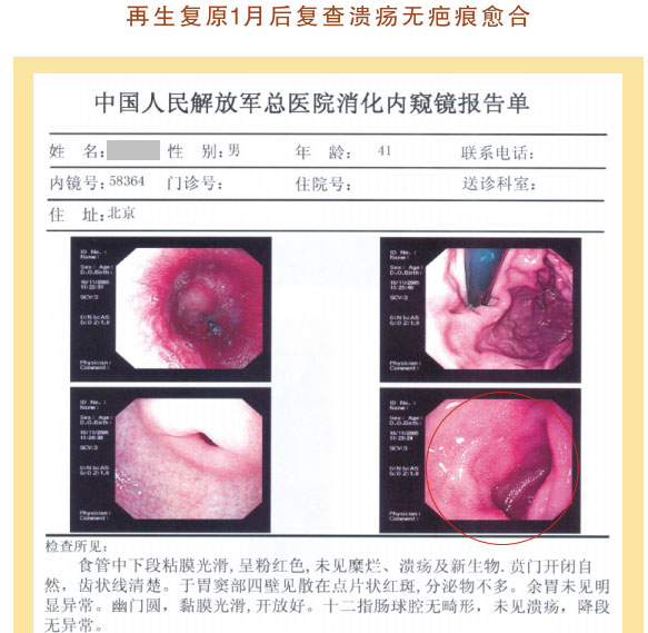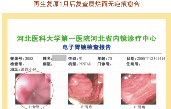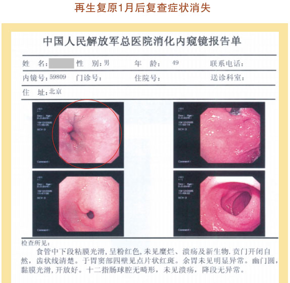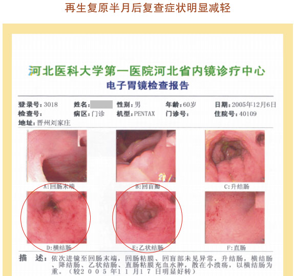 例1:张某某,,,,,,男,,,,,,56岁,,,,,, 2007年5月最先胃肠再生回复,,,,,,半年后整个胃肠系统大部分再生回复,,,,,,粘膜体征均体现为年轻状态。。。。。