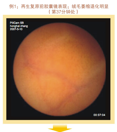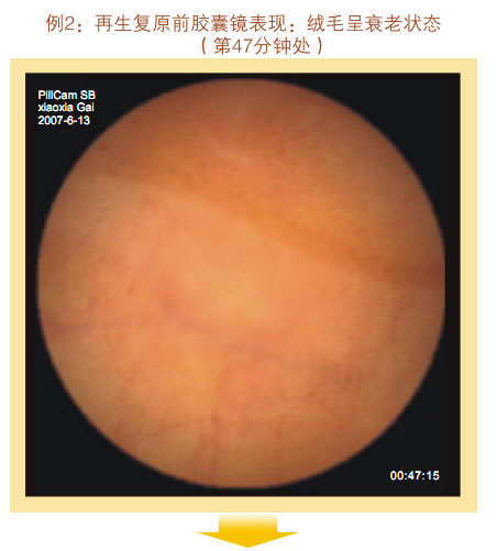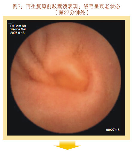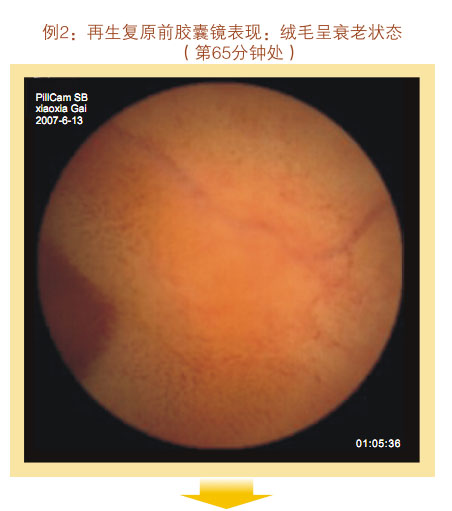再生回复前胶囊镜体现:小肠粘膜和粘膜下层显着萎缩,,,,,,变薄,,,,,,粘膜下血管网及血管畔清晰可见,,,,,,绒毛希罕、增宽而短、断裂、退化、部分区域绒毛脱落甚至脱失,,,,,,隐窝深度变浅。。。。。整个胃肠黏膜系统泛起朽迈状态。。。。。