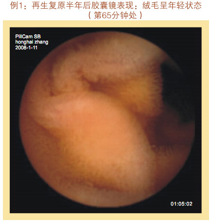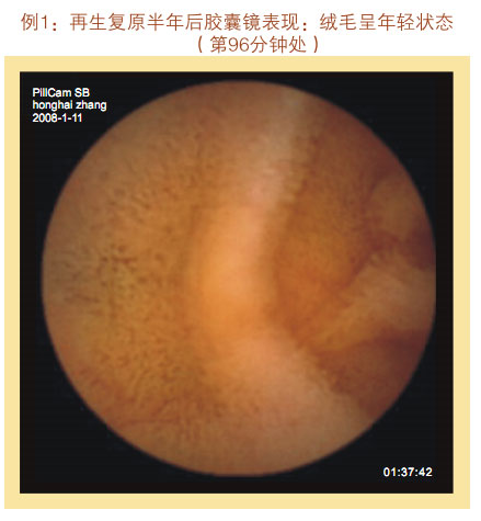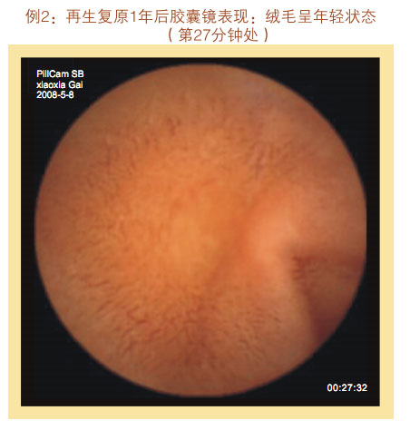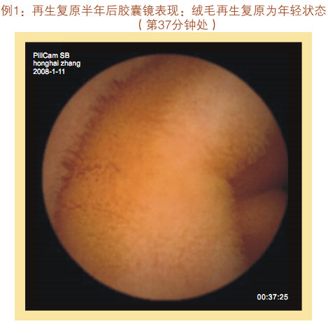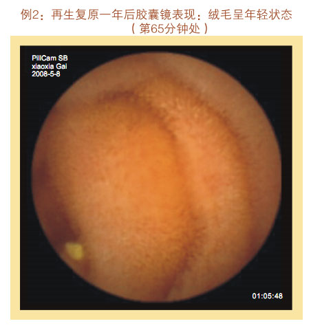 再生回复一年后胶囊镜体现:小肠粘膜和粘膜下层显着增厚,,,,,,看不到粘膜下血管网及血管畔,,,,,,绒毛浓密、长度增添,,,,,,直径增粗,,,,,,没有显着断裂、脱落、脱失的绒毛粘膜,,,,,,隐窝变深。。。。。整个胃肠黏膜系统泛起为年轻康健的状态。。。。。