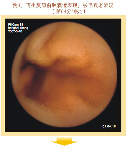 再生回复前胶囊镜体现:小肠粘膜和粘膜下层显着萎缩退化,,,,,,变薄,,,,,,粘膜下血管网及血管畔清晰可见,,,,,,小肠绒毛希罕、长度变短、退化显着,,,,,,部分区域绒毛完全脱失,,,,,,隐窝变浅,,,,,,整个绒毛面积变小。。。。。整个胃肠黏膜系统泛起朽迈状态。。。。。