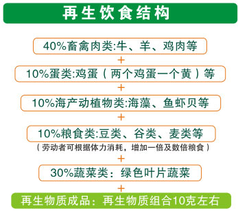 凭证细胞作育获得的人体细胞生长所需的营养比例,,,,,,,我们凭证这个营养因素的比例关系,,,,,,,制订了人的每顿饭的食物组合,,,,,,,简称4:1:1:1:3,,,,,,,即:肉类40%,,,,,,,蛋类10%,,,,,,,海产类10%,,,,,,,粮食10%,,,,,,,蔬菜30%,,,,,,,详见下图: