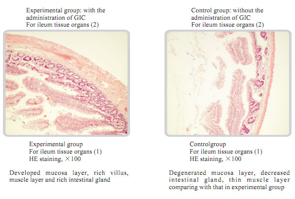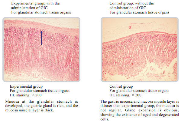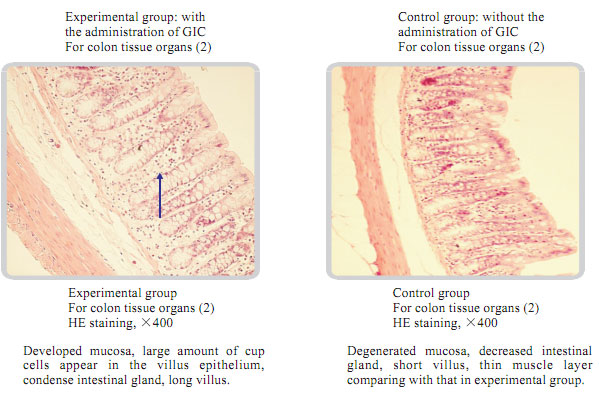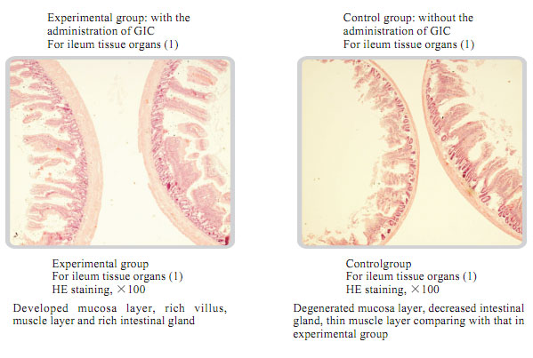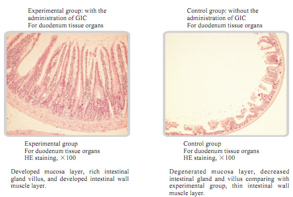 The average life of albino rats was 480 days. The experimental time was twice longer than that. The rats in the experimental group took MEBO GIC showed the vigorous state of the gastrointestinal mucosa, the intestinal gland tissues, and muscular layer with no aging or degeneration signs observed.
