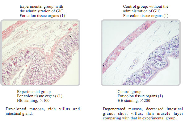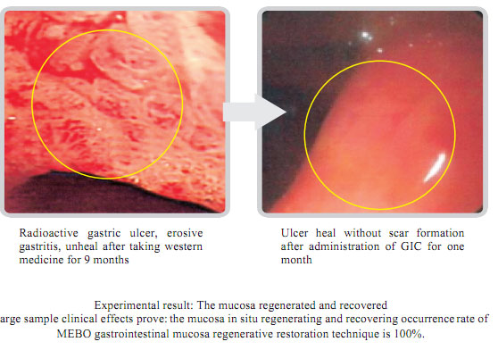 The experimental animal: 10-month-old male albino rats with the average life of 480 days. The experiment lasted for 526 days. The experiment proves: MEBO Gastrointestinal Regenerative Restoration Technique (including MEBO GIC) can maintain the vigorous life of the gastrointestinal mucosa, the related gland tissues, muscular layer of the smooth muscle. However, animals without the administration of GIC show: the atrophy of gastrointestinal mucosa, obvious aging, obviously decreased numbers of glands, thinning of muscular layer of smooth muscle.
