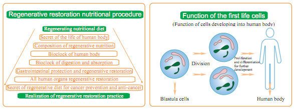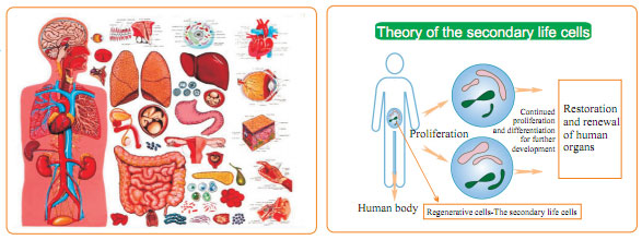 The basis of regenerative restoration refers to the secondary life potential of the human body.  Since the merger of a sperm and an ovum into one cell, the zygote-derived cell will develop into a human being under certain life conditions and last until the end of the person’s life circle, which is the so-called first life of the cell.  So where dose the secondary life cell come from? It is impossible from recombination of sperm and ovum, which would form a new human.  Even the cloned human can not be considered as the original one.  For years, we are making efforts to seek the clue of the existence of regenerative secondary life.  If there is, then where is it?  Finally, this long-chased vision was discovered in our medical practices in treating burns when we found the source of regeneration---the cells which could regenerate into new skin in deep burn wound.  In 1980s, I proposed the theory that human body has the potential of regeneration.  Though I claimed the theory mainly on skin regeneration, no one believed it at that time, and someone even blamed me as fraud.  The opposing voice lasted for many years till the year of 2000 when the truth changed their mind.  By then, we have already started the studies on regeneration of other organs based on the principle of skin regeneration.  The studies were initiated by my assumption that it is possible to realize other organ regeneration if skin regeneration has come true.  The first study is gastrointestinal (GI) tract regeneration.  Considering GI tract and skin derived from two different embryonic germ layers, the success on GI tract regeneration indicates the possibility of regeneration of organs derived from the same germ layer.  So based on the experience from the skin regeneration, I started the study on GI tract mucosa regeneration on the cell level, which was followed by the results of GI mucosa regeneration and restoration in aged gastrointestine within half a year.  The success on GI tract regeneration is more significant than burn skin regeneration or even distal end finger regeneration, because GI tract can represent any internal organs based on their same origin in embryo, and GI tract regeneration means the possibility of all internal organ regeneration.  We have been working on the GI tract regeneration procedure since early 1990s, and completed the first stage by 1997, and published our study results in 2000.  Since 2002, we continued to extend the study from GI tract to 55 tissue organs.  And in 2002, we made a press release titled as “life sciences explosion” when there were 30,000 relevant news reported on the day.  Another five years was spent before all organ regeneration study was finished.  Now, comprehensive human organ regeneration in situ is also completed.