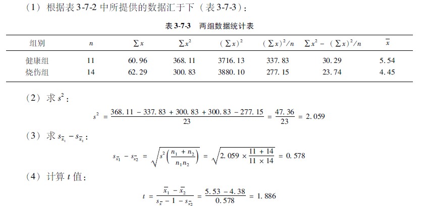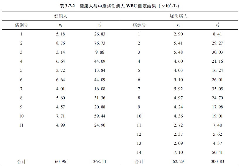 示例375某医生研究中度烧伤病人和康健人的白细胞计数,,,,, ,,,资料于下(表372)。 。。。。。问他们之间有无统计学差别????????