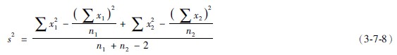 式中的n1和n2代表组1和组2的个样本例数,,,,, ,,,s2是合并标准差的平方。 。。。。。为了盘算利便,,,,, ,,,先以公式求出合并标准差的平方(s2):