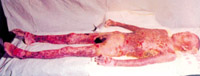 治疗后 四肢微粒皮移植术后,, ,, , ,,创面关闭(胸、手、背、脚背脱痂后晚期植皮,, ,, , ,,尚有肉芽创面剩余)