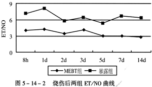 (1) Ѫ½¬ET¡¢NO²â¶¨Ð§¹û:Õý·²ÈËѪ½¬ETÖµ42.8¡À12.2pg/ml,NOÖµ14.5¡À3.6mol/L£¬£¬£¬£¬£¬ET/NOÖ®±ÈԼΪ2.95¡£¡£¡£ ¡£¡£¡£¡£±í5-14-3¼ûÁ½×éÉ˺ó8hѪ½¬ETѸËÙÉÏÉý£¬£¬£¬£¬£¬µ«MEBT×éÔÚ¸÷ʱÏàÉÏÉýˮƽ¾ùµÍÓÚ¸ÉÔï̻¶ÁÆ·¨×飬£¬£¬£¬£¬5Ììºó»Ö¸´µ½Õý³£Ë®Æ½£¬£¬£¬£¬£¬¸ÉÔï̻¶ÁÆ·¨×éÔÚÉ˺ó14ÌìÈÔά³Ö½Ï¸ßˮƽ¡£¡£¡£ ¡£¡£¡£¡£±í5-14-4¼ûÁ½×éÉ˺ó8hѪ½¬NO¾ùѸËÙÉÏÉý£¬£¬£¬£¬£¬1ÌìÆðMEBT×éÖð½¥Ï½µ£¬£¬£¬£¬£¬3Ììºó»Ö¸´µ½Õý³£Ë®Æ½£¬£¬£¬£¬£¬¸ÉÔï̻¶ÁÆ·¨×é7Ììºó²Å»Ö¸´µ½Õý³£Ë®Æ½¡£¡£¡£ ¡£¡£¡£¡£Í¼5-14-2¼ûMEBT×é1ÌìºóET/NO¾ÍÇ÷ÏòÓÚ2.95£¬£¬£¬£¬£¬¶ø¸ÉÔï̻¶ÁÆ·¨×é¸÷ʱÏàET/NOÔ¶¸ßÓÚ2.95¡£¡£¡£ ¡£¡£¡£¡£