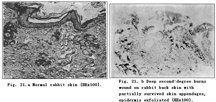 Histologically, the regenerative capacity of skin tissue has a close correlation with tissue repair. Skin cells can be classified into two categories according to the different capability of regeneration: 1) Constantly changing cells ,, , ,, ,,i.e. epidermal cells that have the ability to divide for indefinite periods under a normal state and proliferate to compensate shed and consumed cells. 2) Stable cells as epithelium in the skin body of a gland that cease proliferation when the organs mature, but have a continuous potential for division which is activated after injury to regenerate [1]. Tissue repair is also achieved by two approaches. First, by the regeneration of tissues similar both in structure and function- the structure and function of repaired tissue can be entirely identical to those of the original[2]. Take, for example, the tissue repair of superficial second-degree burns wounds. On days 3~4 postburn, epithelia began to grow, and continued thusly on days 5~8 and was mostly completed on days 8~10 postburn. Secondly, repair of the damaged tissues can be achieved through the formation of fibrous tissue, beginning with formation of granular tissues and ending with scar formation. Microscopic examinations of the tissue repair of deep second-degree and third-degree burns wounds showed an intertexture mainly comprised of fibroblasts and neoformative blood capillaries. Together with infiltration of plasmocytes (such as neutrophil, lymphocyte, plasma cell, macrophage), we note neoformative granulation tissues that were then replaced by a great quantity of closely aligned collagenous intercellular fibers. Subsequent to the decrease of fibroblasts, showing a long and narrow shape, and of blood capillaries, these tissues eventually developed into scars.