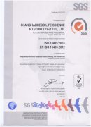 上海公司自2013年4月向国际着名的认证公司SGS提交了ISO13485质量管理系统认证申请,,, ,,,通过系统文件审核和现场审核,,, ,,,各项指标均抵达了UK审核标准,,, ,,,10月30日获得了ISO13485:2003/ENISO13485:2012的系统证书。。 。。。。。。