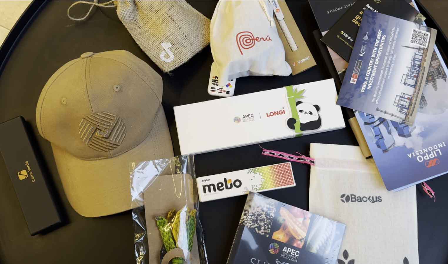 翻开礼物袋,,,,,,内里包括一款带有APEC CEO峰会标记的棒球帽、一个细腻的皮质护照夹;; ;;;;;;生长在利马周边山丘上濒临灭绝的植物“紫条六出花”胸针;; ;;;;;;而秘鲁的国宝级动物小羊驼也被巧妙地设计成了钥匙链;; ;;;;;;尚有一款由百分百羊驼毛制成的秘鲁工艺品更是展现了外地人民的精湛武艺和奇异审美;; ;;;;;;为了让与会代表更好地相识秘鲁风土人情,,,,,,礼物袋中还特殊配备了外地美食小册子等;; ;;;;;;值得一提的是,,,,,,象征友谊的熊猫徽章也成为了礼物袋中的一份子,,,,,,寓意着APEC成员国之间的友好关系和细密合作。。。。。。